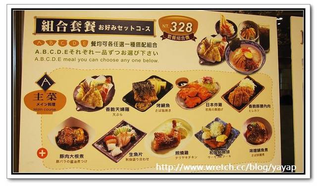 A.主菜:香脆天婦羅、烤鯖魚、日本炸雞、香脆豚腰內肉、