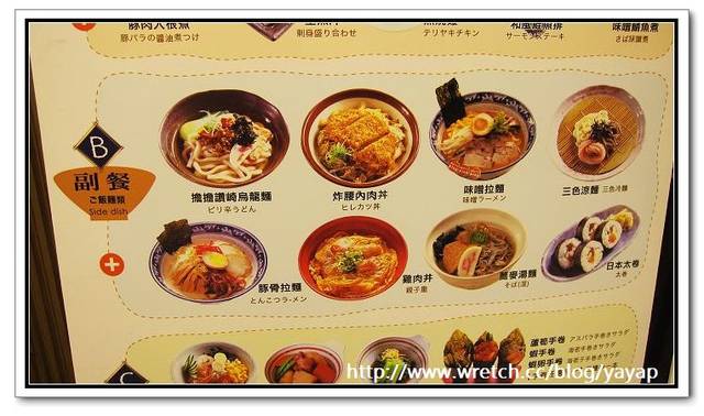 B.副餐:擔擔讚崎烏龍麵、炸腰內肉丼、味噌拉麵、三色涼麵、豚骨拉麵、