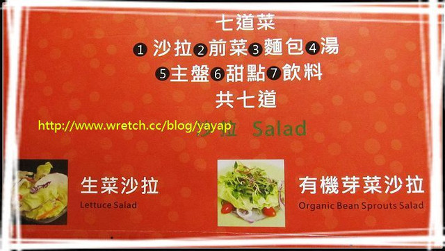 套餐包含七道菜:沙拉、前菜、麵包、湯、主盤、甜點、飲料
