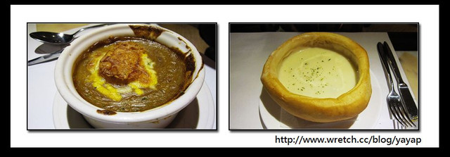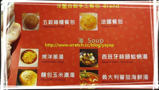 湯:烤洋蔥湯、西班牙蒜頭蛤蠣湯、麵包玉米濃湯、義大利蕃茄海鮮湯