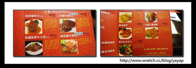 主菜:紐西蘭菲力、紐西蘭沙朗牛排、美國無骨牛小排、紐西蘭紐約客牛排、