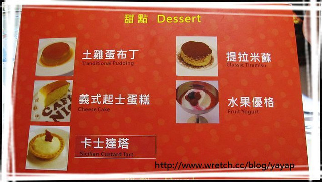 甜點:土雞蛋布丁、提拉米蘇、義式起士蛋糕、水果優格、卡式達塔