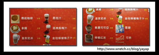 飲料:(熱)傳統咖啡、拿鐵、皇家奶茶、香濃可可亞、檸檬紅茶、