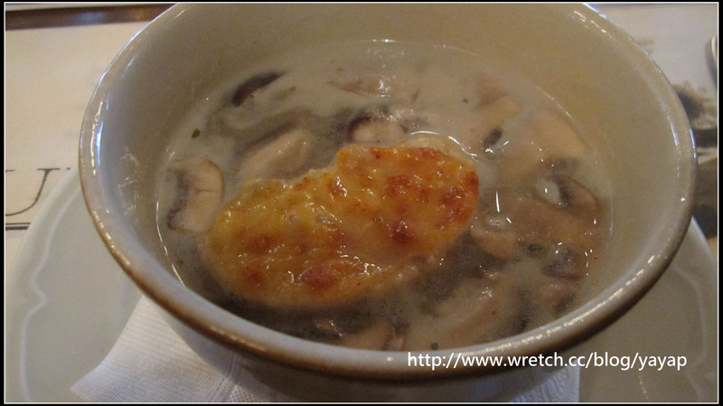 這是蘑菇清湯,放了一小塊焗烤麵包,好好吃唷!