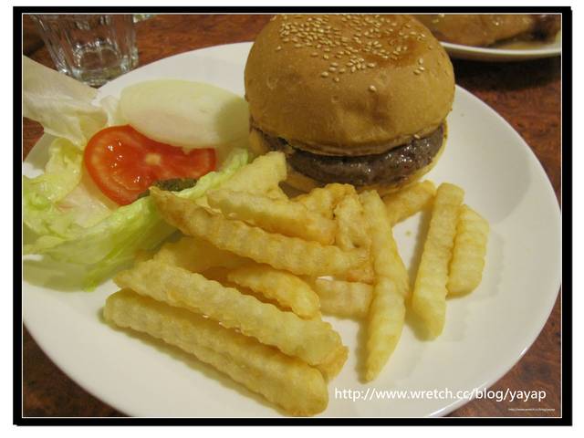 漢堡的肉挺厚的,吃起來也算挺多汁的!