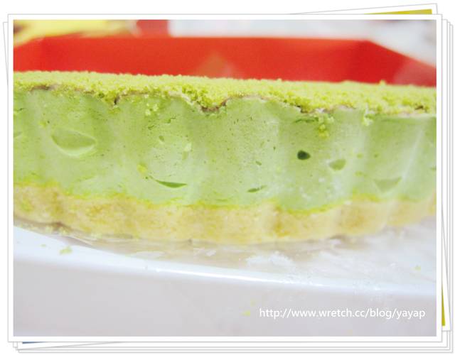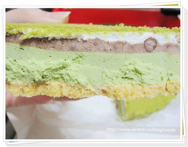 最下面是派皮,接下來中間是抹茶慕司,往上是屏東特選的紅豆,