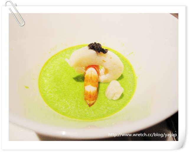 看看翡翠綠的蒸蛋上面放著海鮮,上面還放上一點點松露,