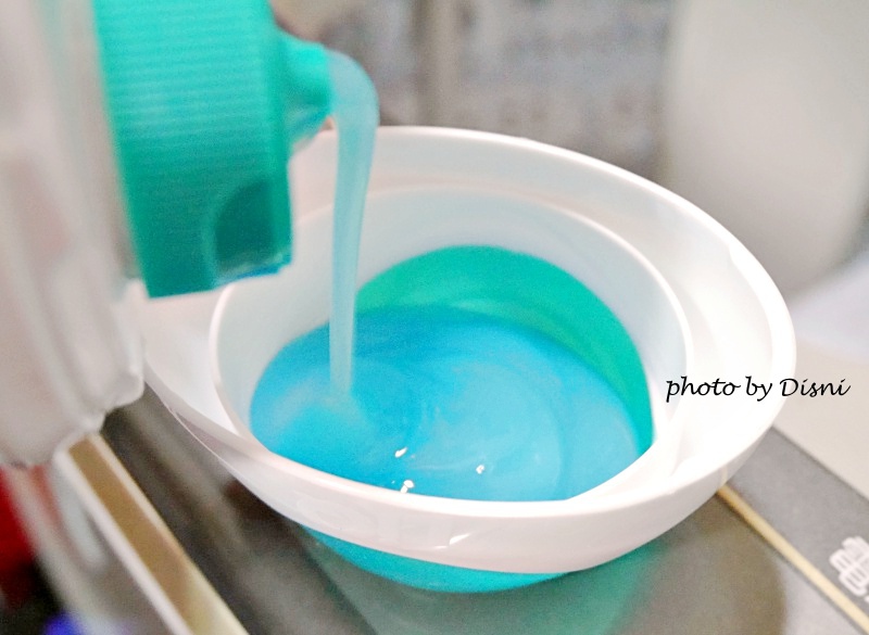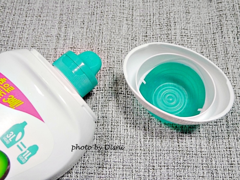 上面這瓶蓋可以拿來當做量杯,將要使用的洗衣精倒入瓶蓋中。