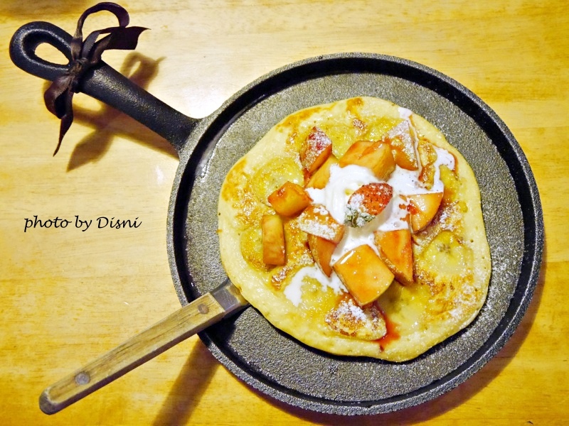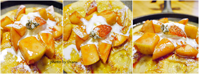 上面放著紅酒蘋果及香蕉,跟底下的煎餅搭配起來非常適合,